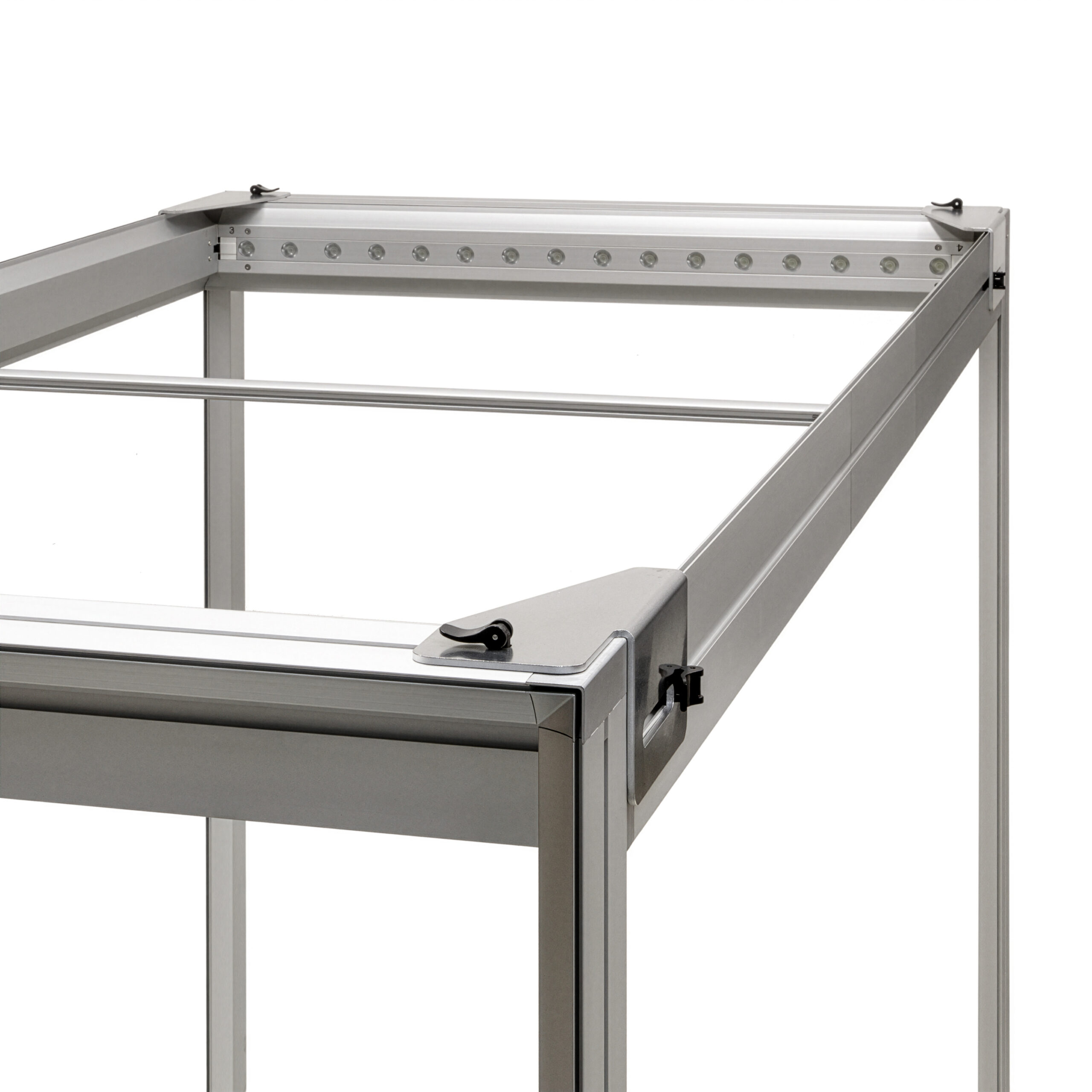 Dankzij het elegante, zilverkleurige aluminium profiel en de meegeleverde connectors, monteer je het dak eenvoudig aan de wandpanelen.